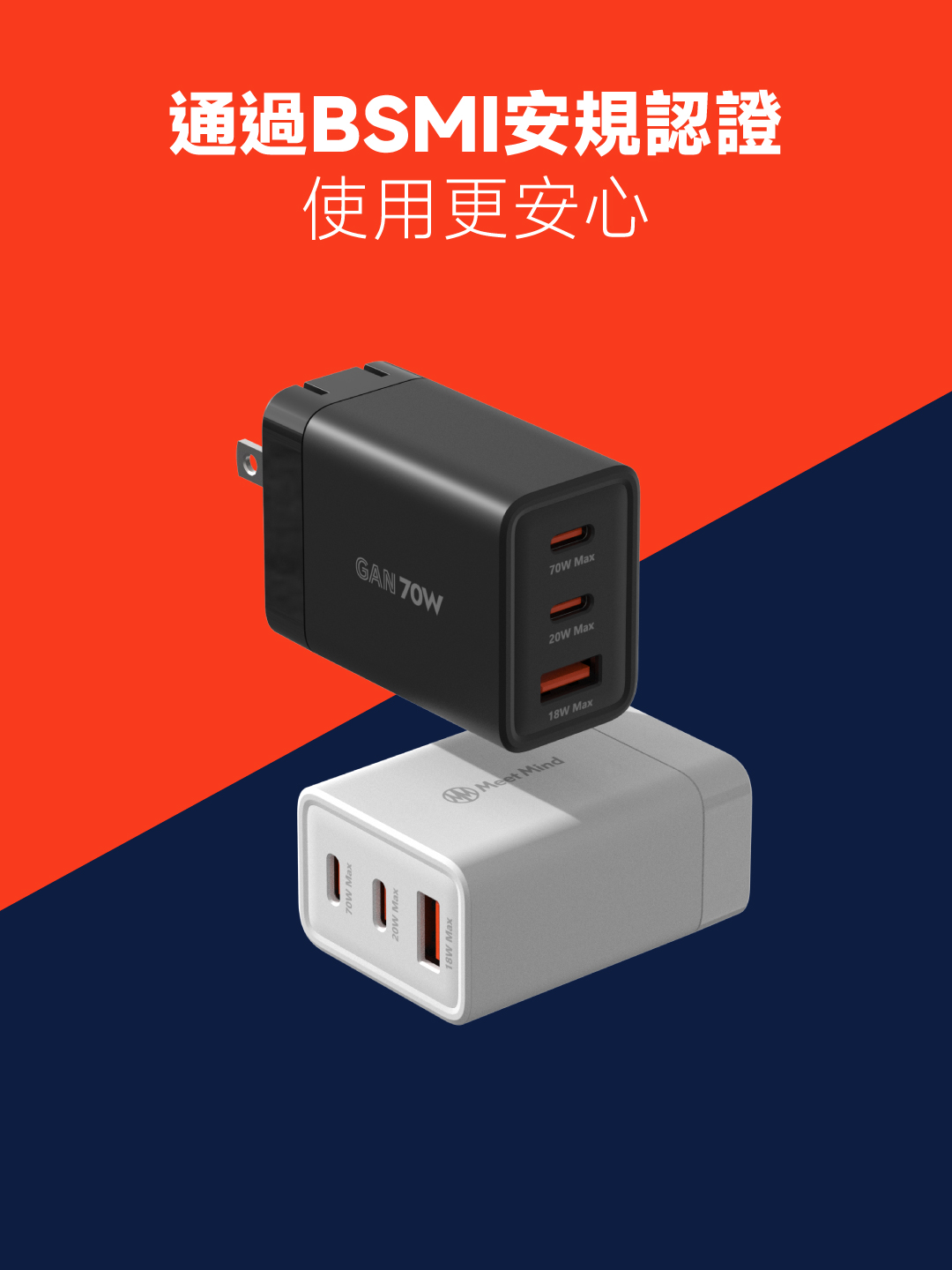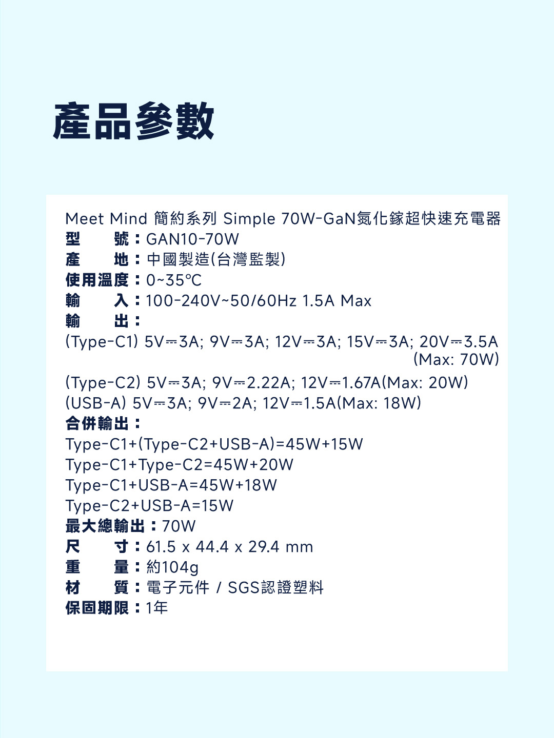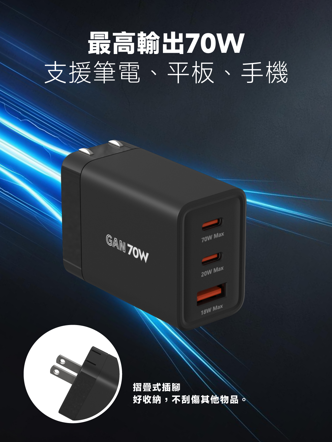 簡約系列 Simple 70W-GaN氮化鎵超快速充電器 (3孔2C1A)