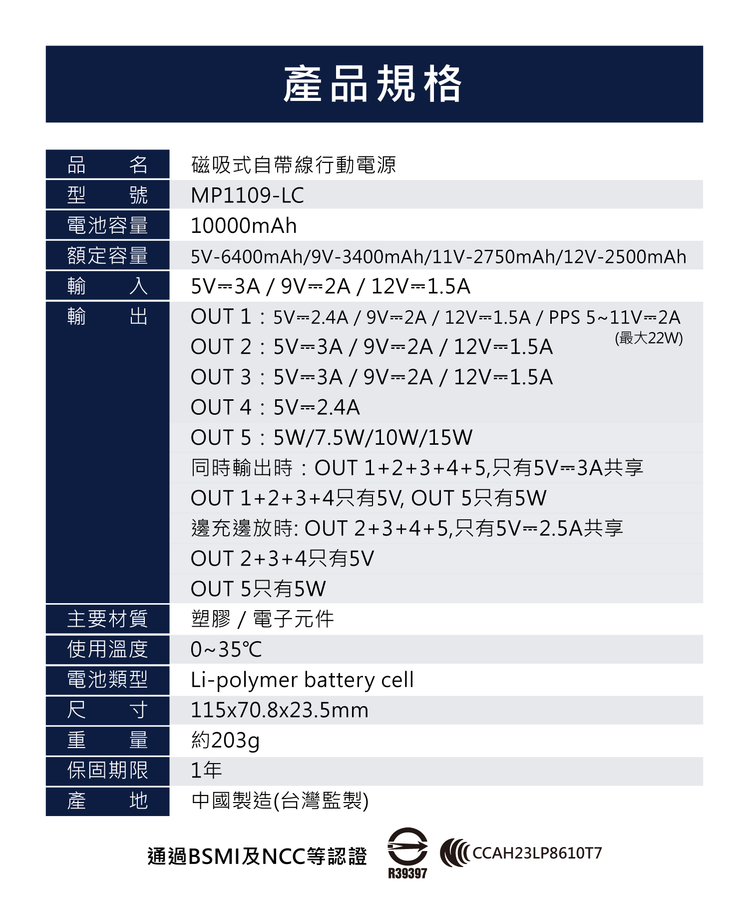 額定容量:5V-6400mAh/9V-3400mAh/11V-2750mAh/12V-2500mAh