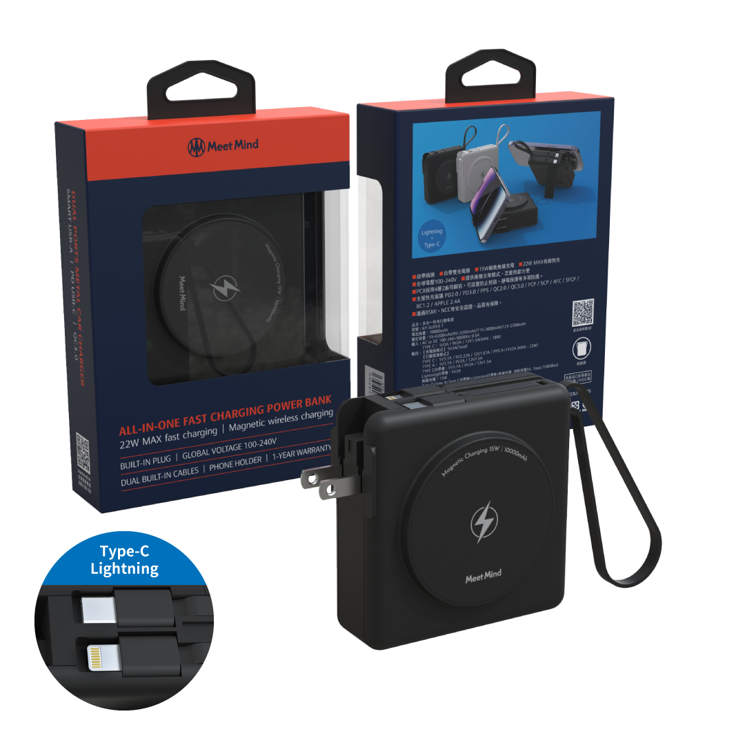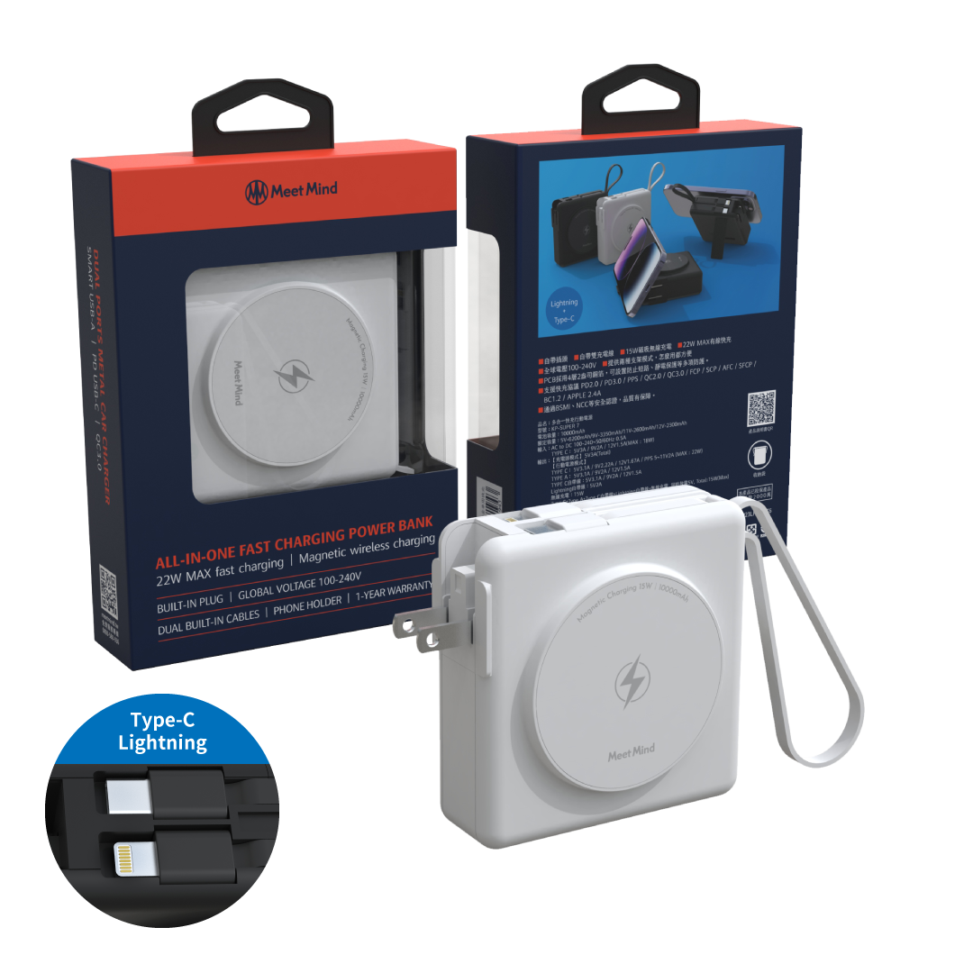 (5折福利品出清) 10000mAh 22W多合一快充行動電源-自帶線Type-C+Lightning版